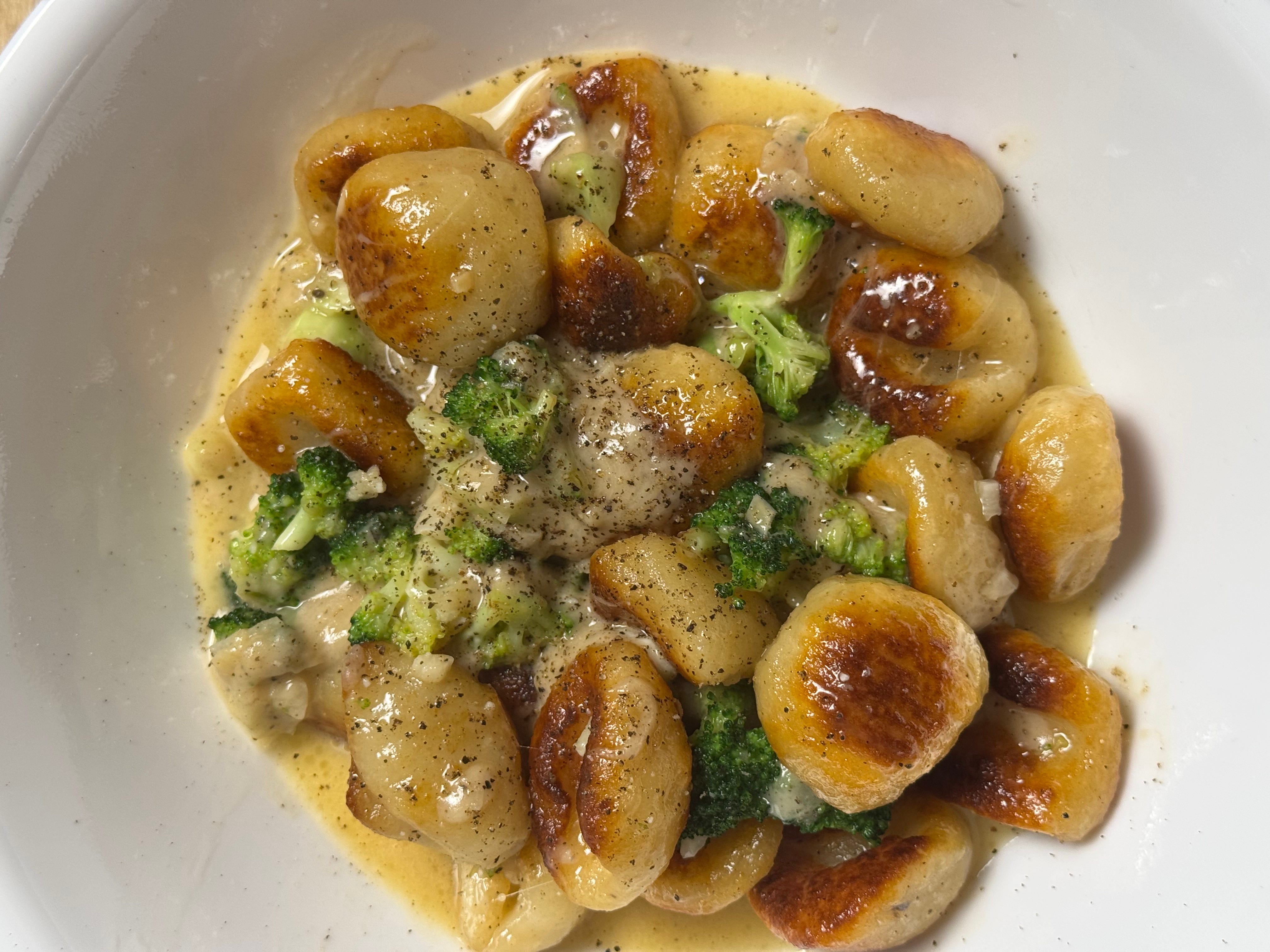 Brown the gnocchi in olive oil and butter.